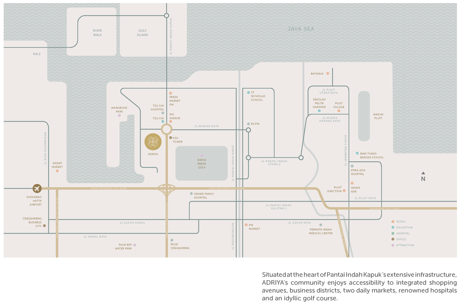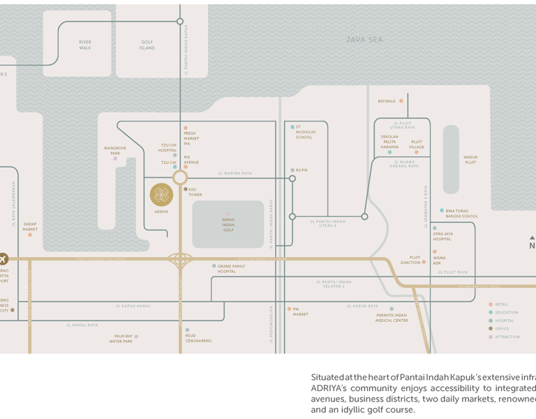 An enhanced notion of sophistication and elegance nested in lush, natural ambiance, the ADRIYA community invites you to immerse yourself into Pantai Indah Kapuk’s diverse, elevated urban lifestyles.